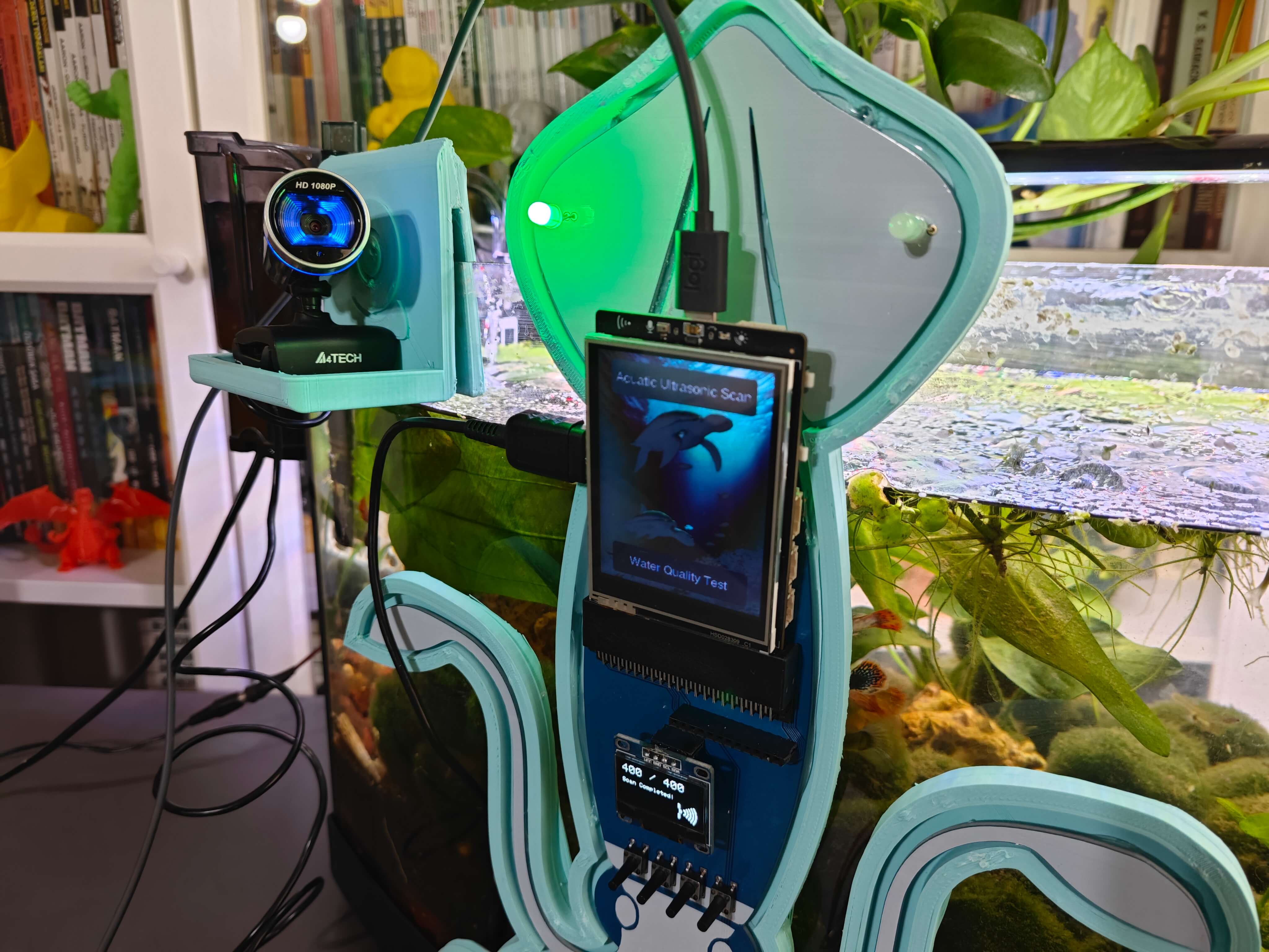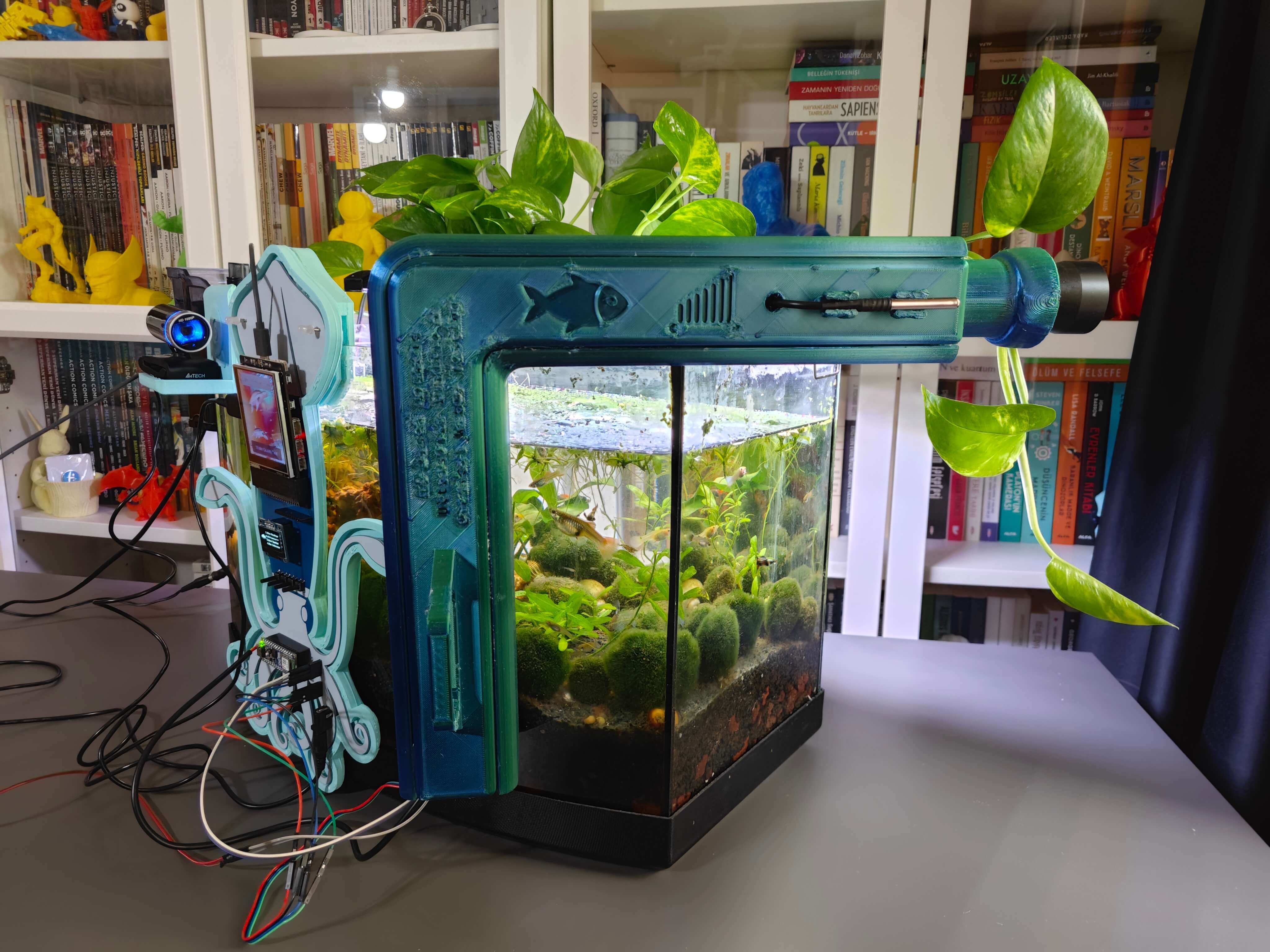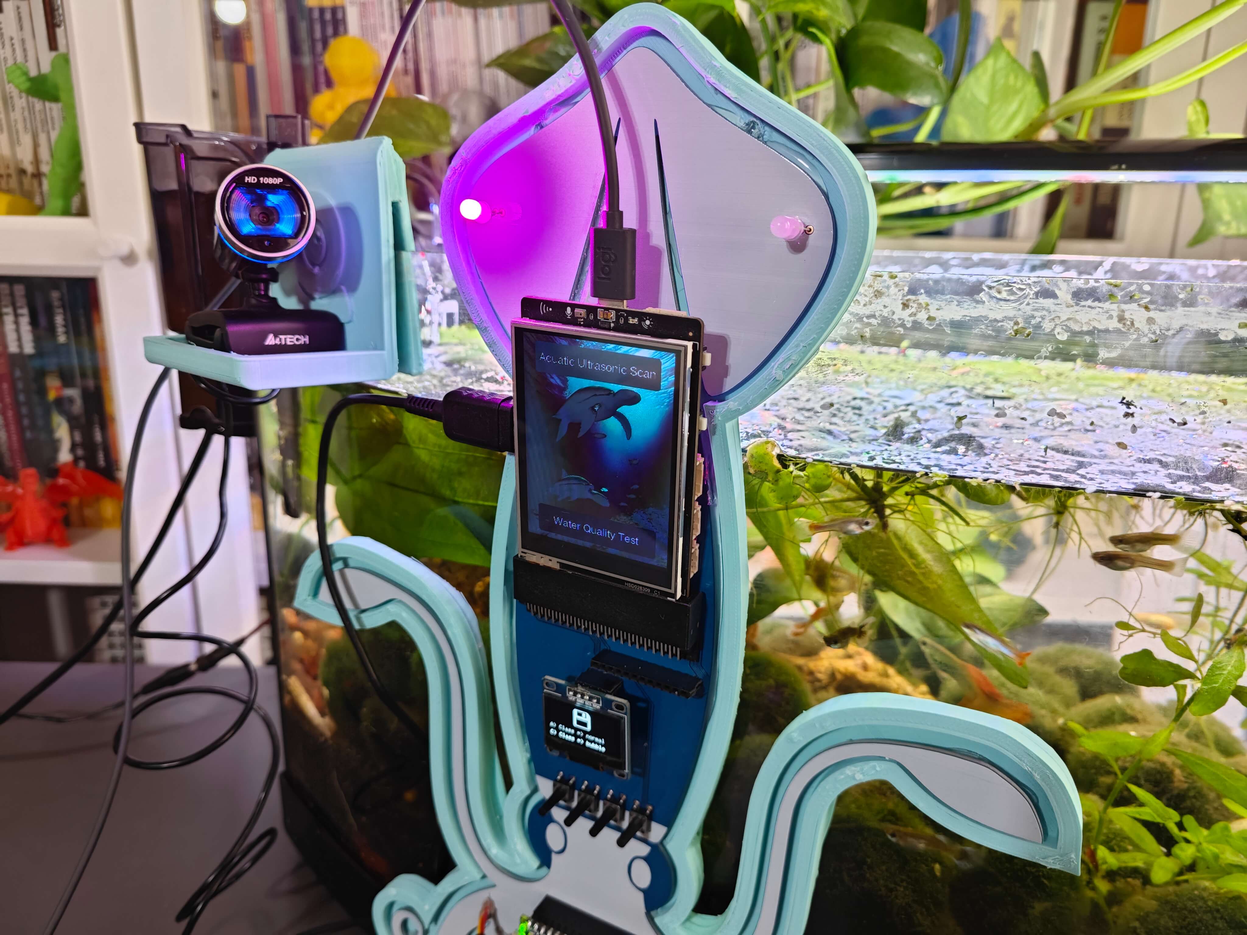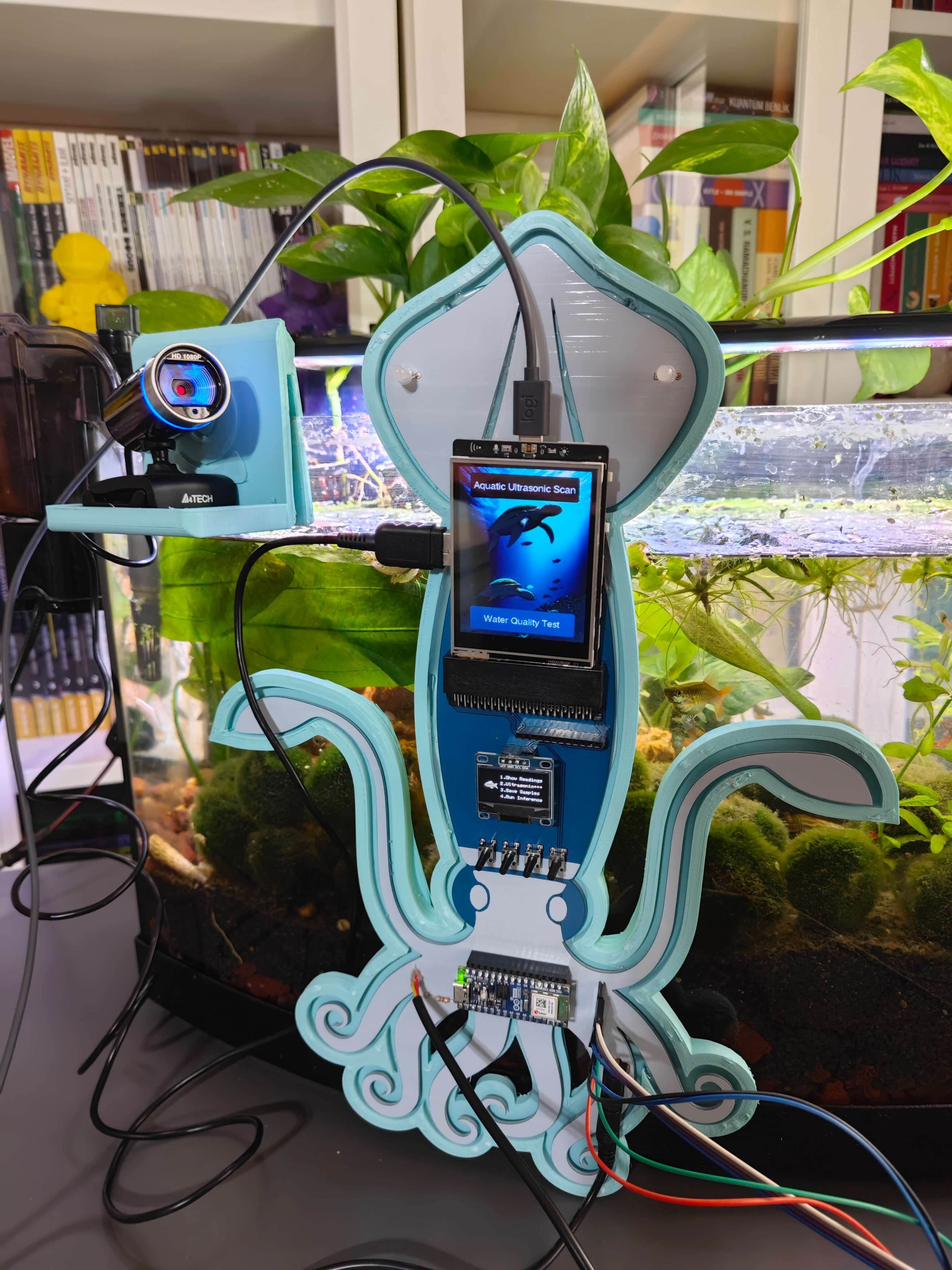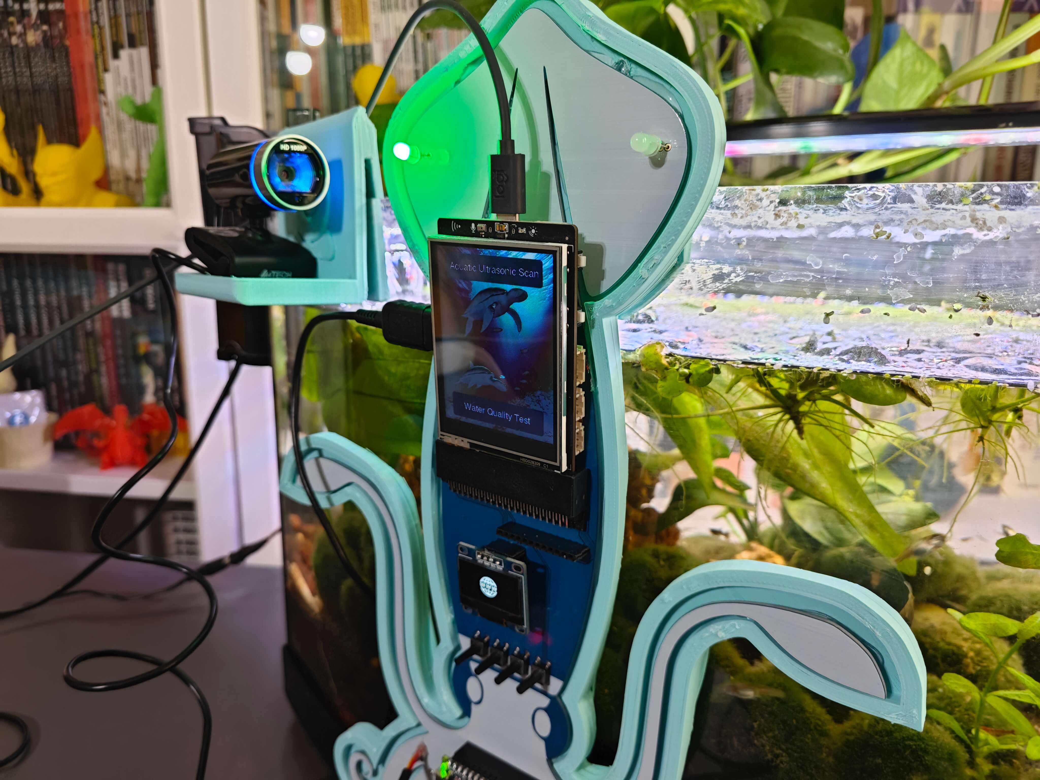 สุดท้าย เพื่อให้อุปกรณ์มีความทนทานและกะทัดรัดที่สุดเท่าที่จะเป็นไปได้ ผมได้ออกแบบเคสธีมสัตว์น้ำที่เข้าชุดกัน (แบบ 3D printable) พร้อมตัวยึดแบบ Modular ที่หุ้มโครงร่างของ PCB, ตัวยึดแบบแขวนขอบตู้ปลาที่ติดตั้งเข้ากับตัวยึด PCB, ตัวยึดกล้องแบบแขวนเพื่อวาง USB webcam คุณภาพสูงเมื่อไม่ได้ใช้งาน และฝาปิดด้านบนแบบถอดได้ที่ช่วยให้ผู้ใช้สามารถเชื่อมต่อ Sensor เข้ากับช่องที่กำหนด ตัวยึดรูปครึ่งวงกลมได้รับการออกแบบมาเป็นพิเศษเพื่อให้บรรจุ Sensor วัดอุณหภูมิแบบกันน้ำได้พอดี