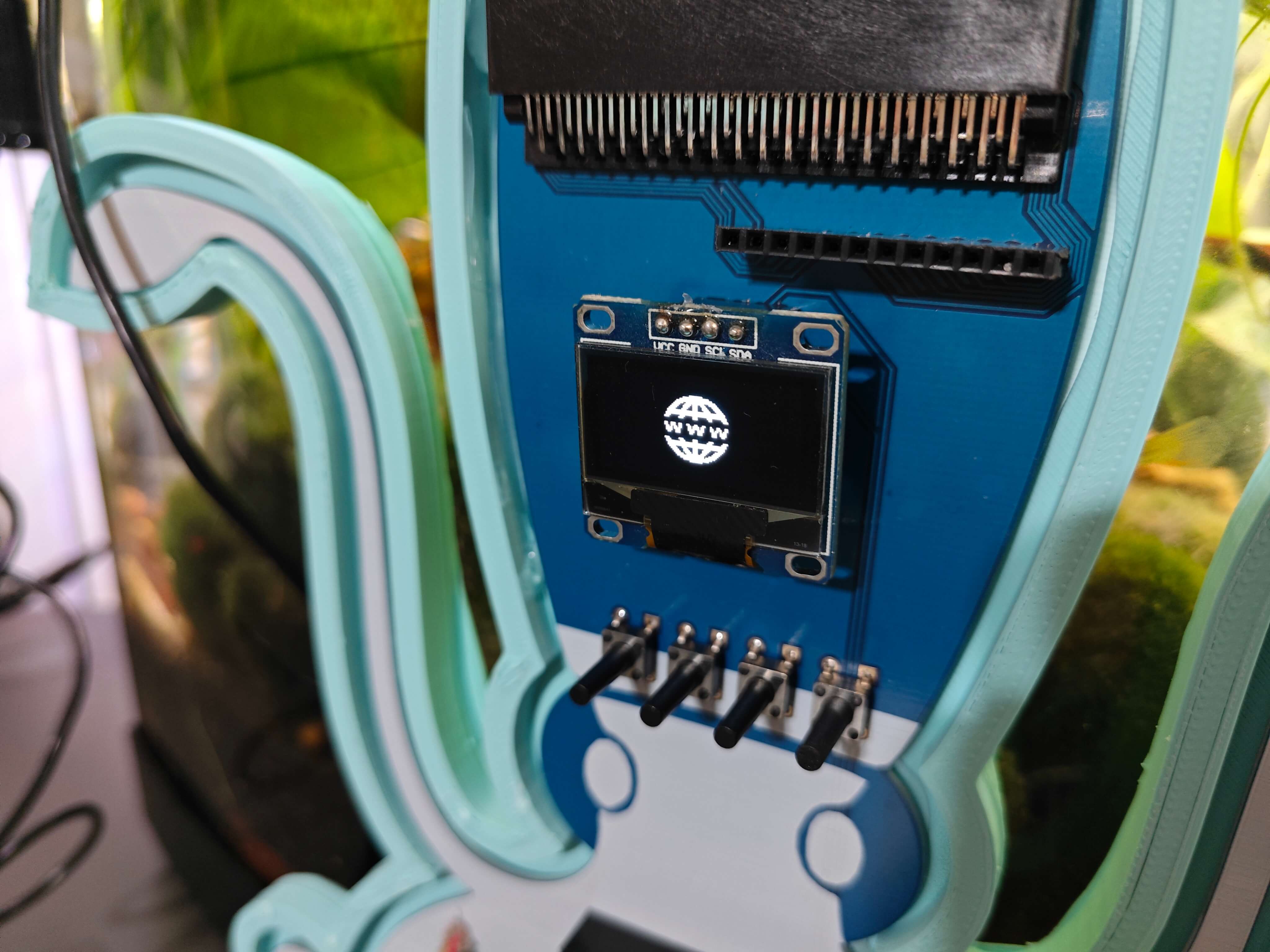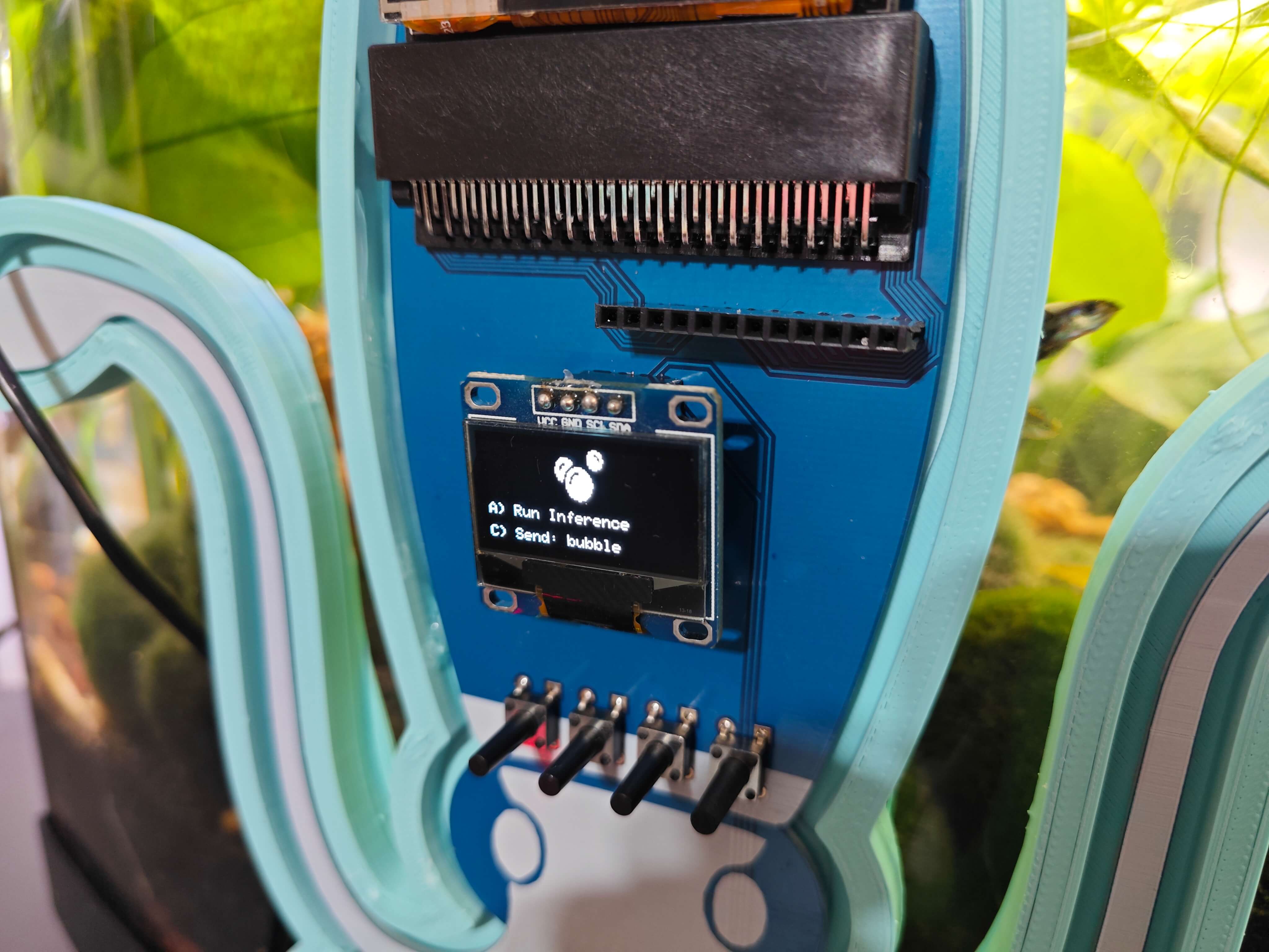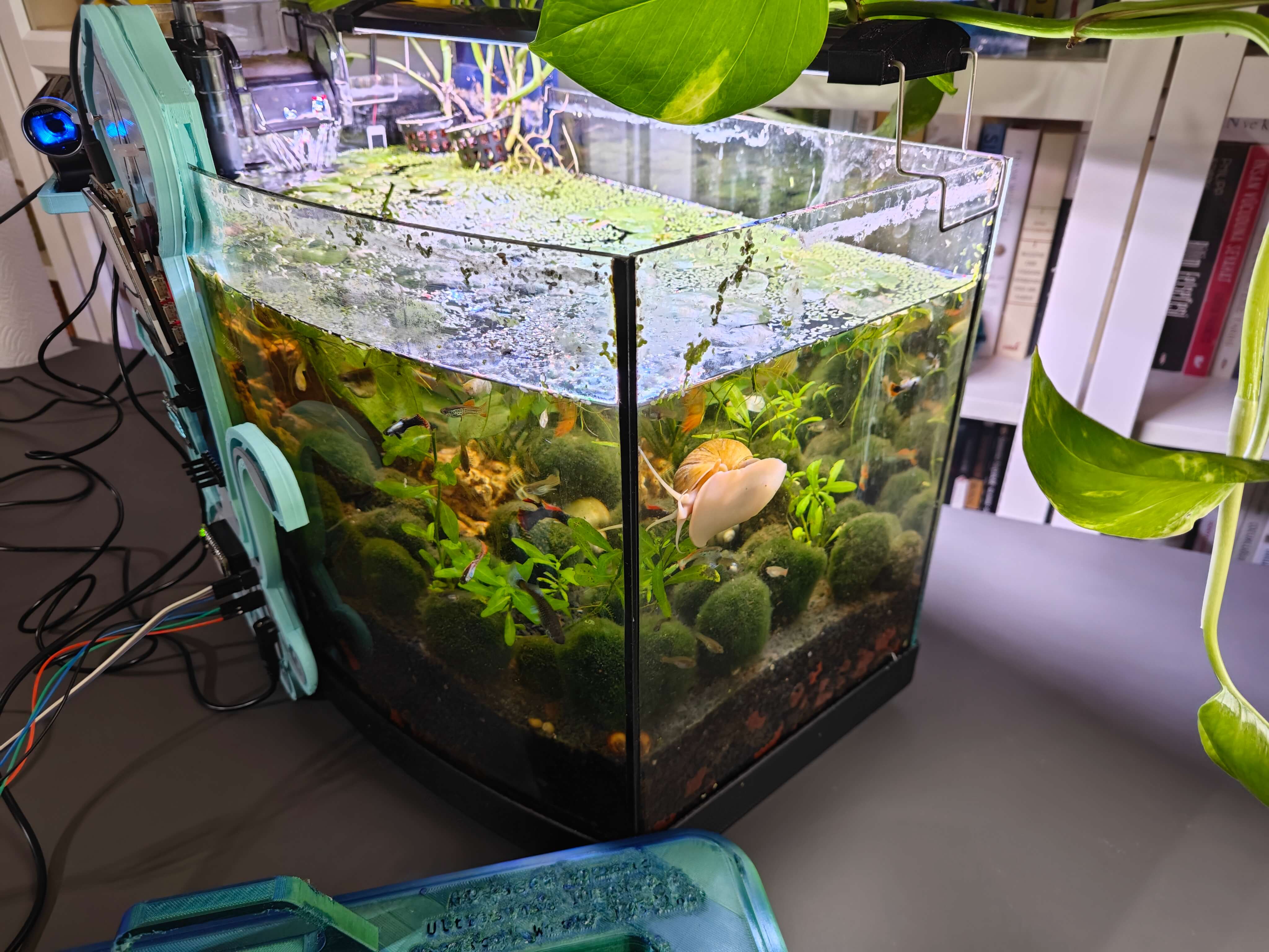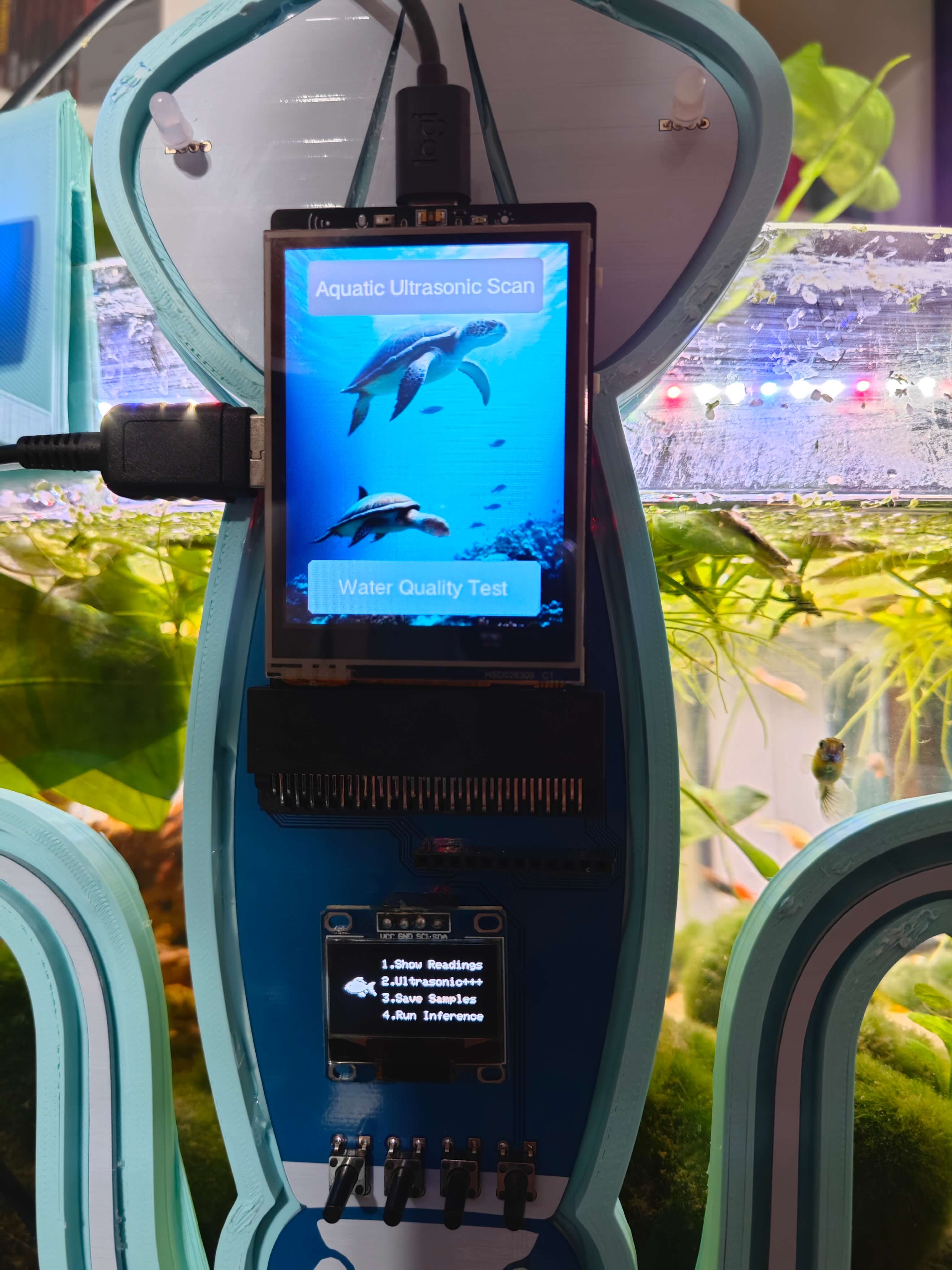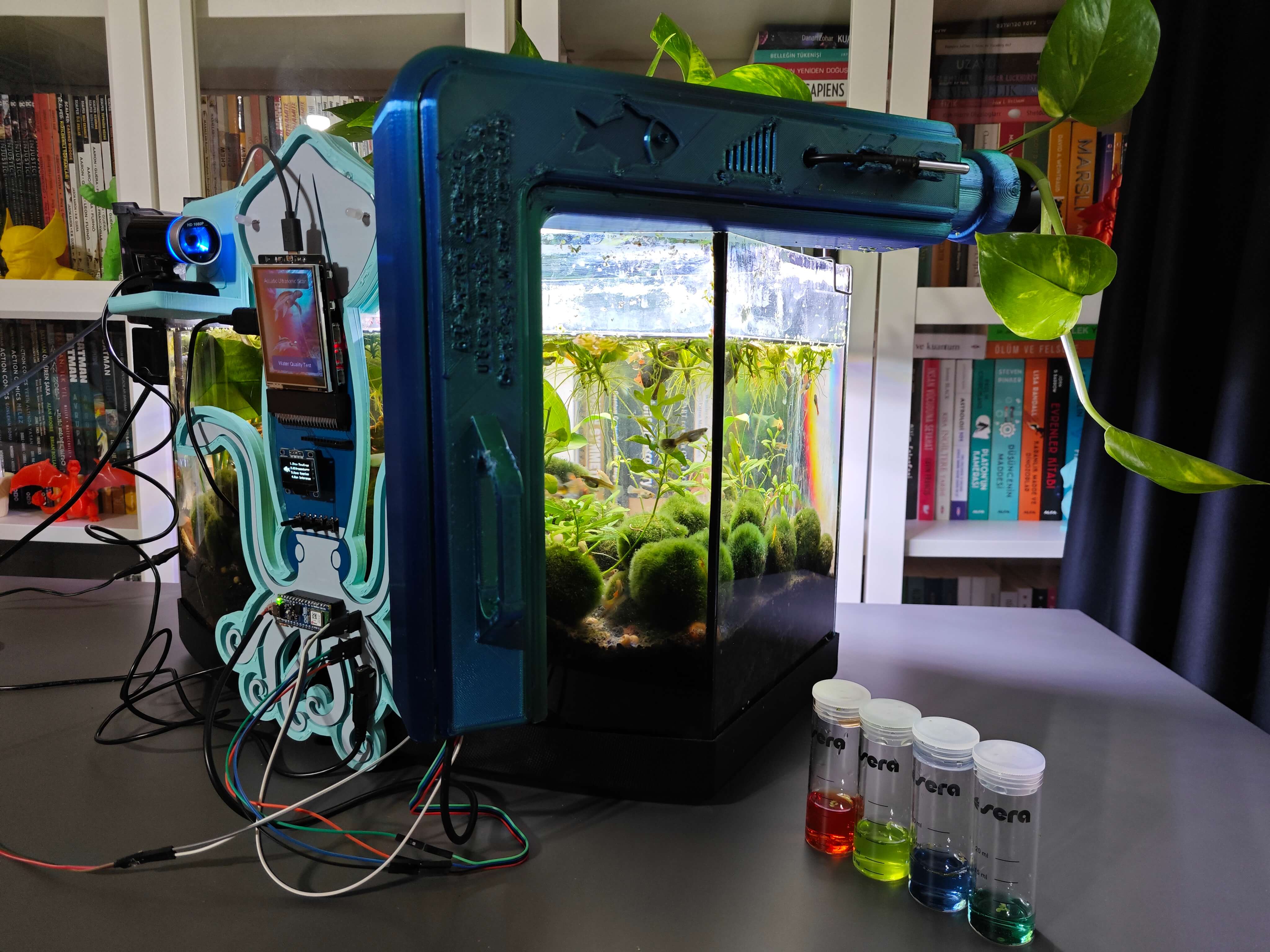 สุดท้าย เพื่อให้อุปกรณ์มีความทนทานและกะทัดรัดที่สุดเท่าที่จะเป็นไปได้ ผมได้ออกแบบเคสธีมสัตว์น้ำที่เข้าชุดกัน (แบบ 3D printable) พร้อมตัวยึดแบบ Modular ที่หุ้มโครงร่างของ PCB, ตัวยึดแบบแขวนขอบตู้ปลาที่ติดตั้งเข้ากับตัวยึด PCB, ตัวยึดกล้องแบบแขวนเพื่อวาง USB webcam คุณภาพสูงเมื่อไม่ได้ใช้งาน และฝาปิดด้านบนแบบถอดได้ที่ช่วยให้ผู้ใช้สามารถเชื่อมต่อ Sensor เข้ากับช่องที่กำหนด ตัวยึดรูปครึ่งวงกลมได้รับการออกแบบมาเป็นพิเศษเพื่อให้บรรจุ Sensor วัดอุณหภูมิแบบกันน้ำได้พอดี