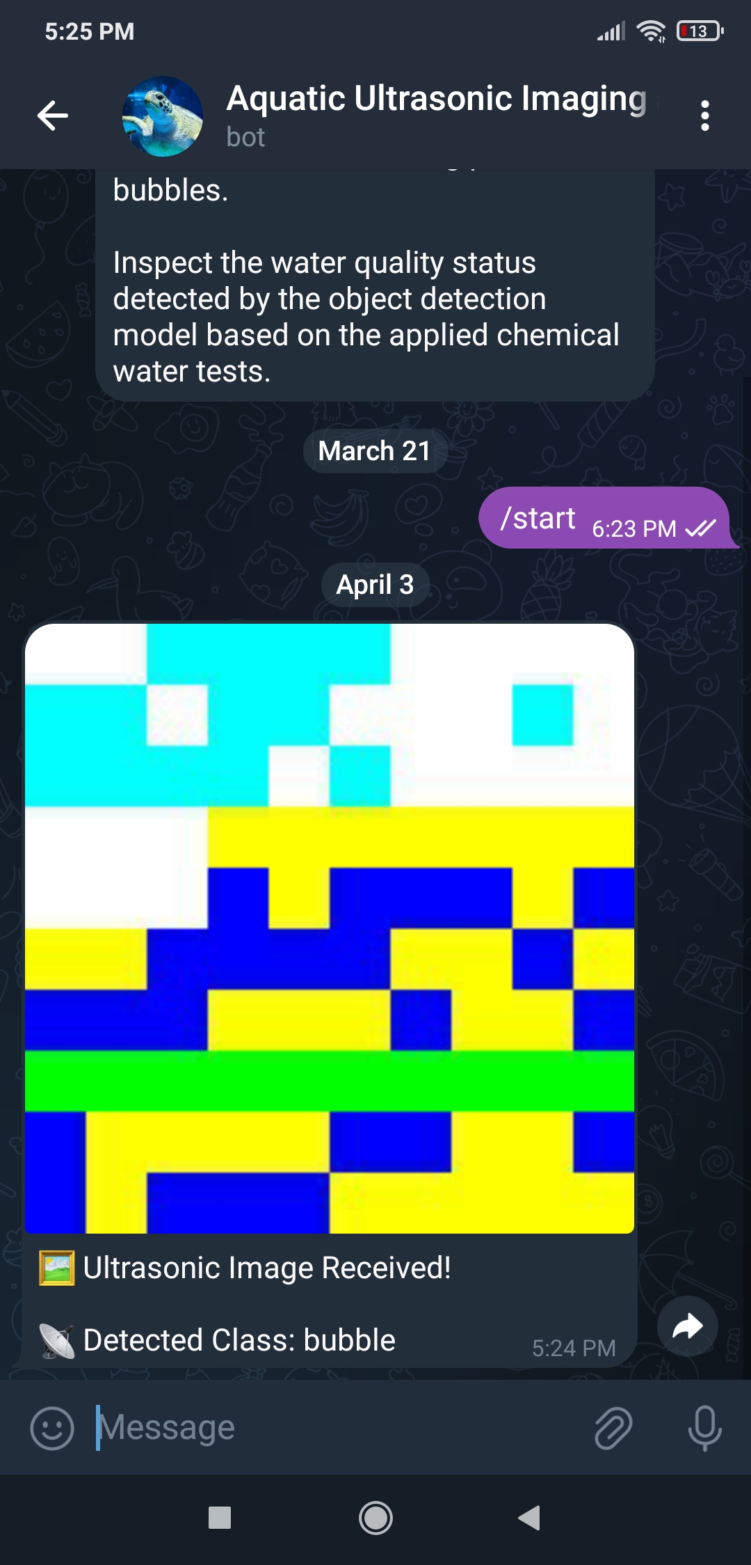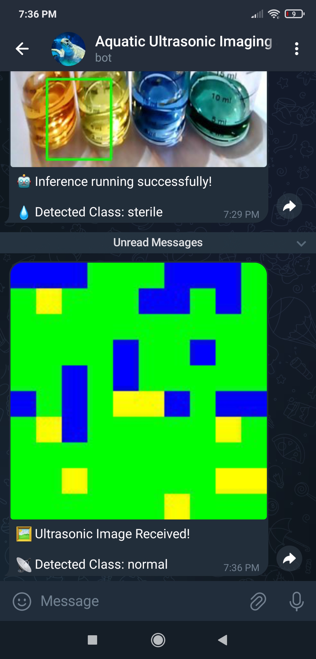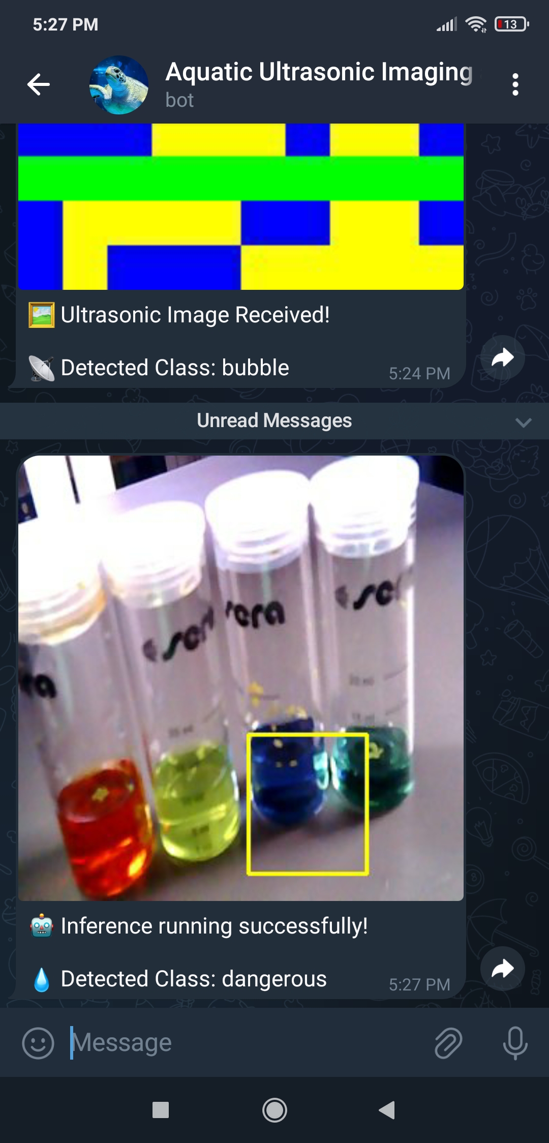 หลังจากทำการทดลองกับทั้งสอง Model และได้ผลลัพธ์ที่สำคัญ ผมจึงตัดสินใจตั้งค่า Telegram bot พื้นฐานเพื่อแจ้งให้ผู้ใช้ทราบถึงผลการตรวจจับของ Model ล่าสุด โดยการส่งภาพ Ultrasonic ล่าสุดที่สร้างขึ้นพร้อมคลาสฟองอากาศที่ตรวจพบ และภาพผลลัพธ์ที่แก้ไขล่าสุดของ Object detection model เนื่องจาก Telegram เป็นบริการส่งข้อความบน Cloud ข้ามแพลตฟอร์มพร้อม Bot API พื้นฐาน HTTP ที่รองรับอย่างเต็มที่ Telegram bots จึงสามารถรับภาพจากที่เก็บข้อมูลในเครื่องได้โดยตรงโดยไม่ต้องใช้บริการ Hosting ดังนั้น ผมจึงสามารถส่งภาพที่แก้ไขแล้ว (ของทั้งสอง Model) จาก UNIHIKER ไปยัง Telegram bot ได้โดยไม่ต้องสร้างการเชื่อมต่อ SSL