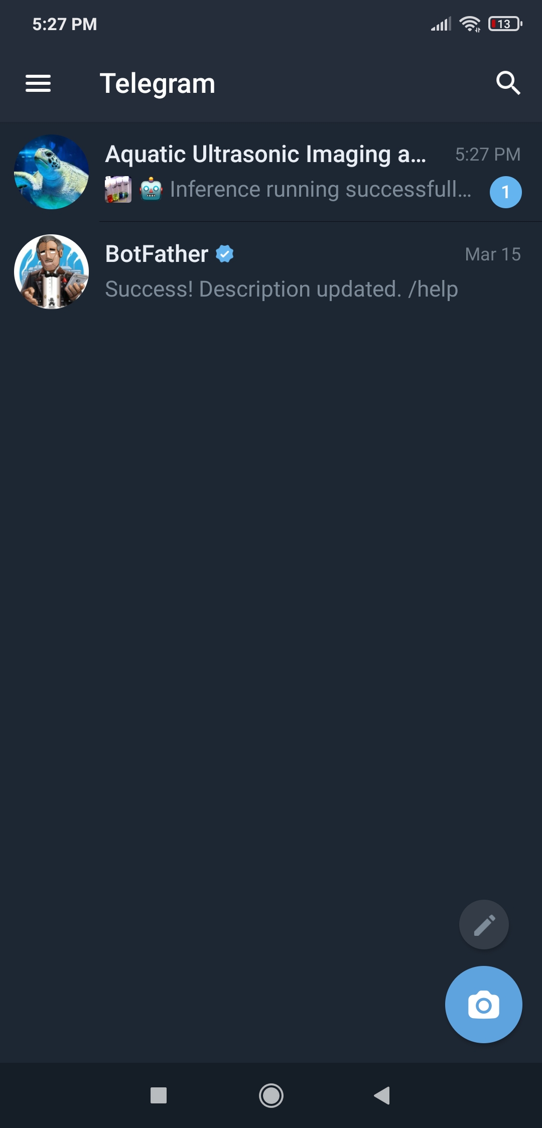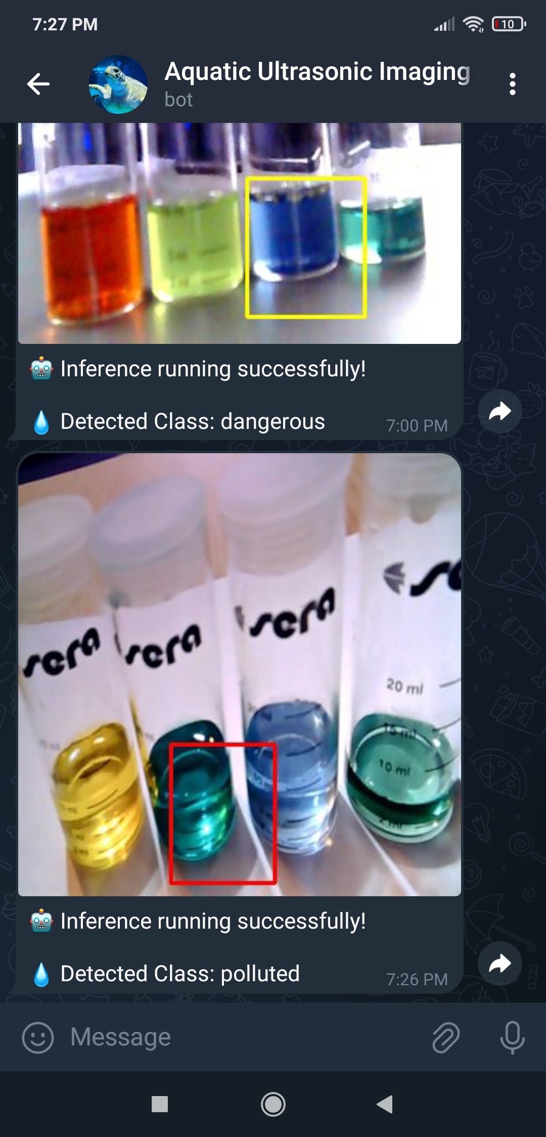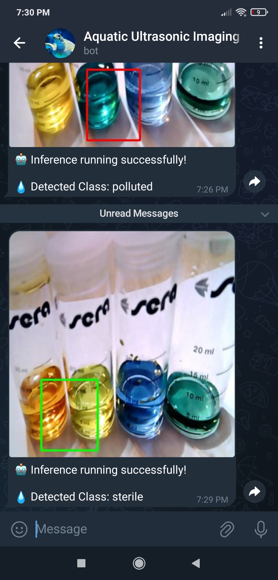 หลังจากทำการทดลองกับทั้งสอง Model และได้ผลลัพธ์ที่สำคัญ ผมจึงตัดสินใจตั้งค่า Telegram bot พื้นฐานเพื่อแจ้งให้ผู้ใช้ทราบถึงผลการตรวจจับของ Model ล่าสุด โดยการส่งภาพ Ultrasonic ล่าสุดที่สร้างขึ้นพร้อมคลาสฟองอากาศที่ตรวจพบ และภาพผลลัพธ์ที่แก้ไขล่าสุดของ Object detection model เนื่องจาก Telegram เป็นบริการส่งข้อความบน Cloud ข้ามแพลตฟอร์มพร้อม Bot API พื้นฐาน HTTP ที่รองรับอย่างเต็มที่ Telegram bots จึงสามารถรับภาพจากที่เก็บข้อมูลในเครื่องได้โดยตรงโดยไม่ต้องใช้บริการ Hosting ดังนั้น ผมจึงสามารถส่งภาพที่แก้ไขแล้ว (ของทั้งสอง Model) จาก UNIHIKER ไปยัง Telegram bot ได้โดยไม่ต้องสร้างการเชื่อมต่อ SSL