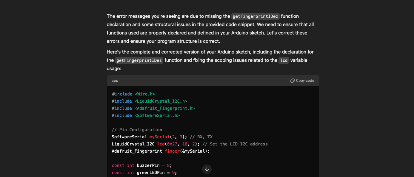 ในระหว่างกระบวนการพัฒนา ผมพบข้อผิดพลาดในการ Compile: "'getFingerprintIDez' was not declared in this scope." ข้อผิดพลาดนี้แม้จะไม่ได้ตั้งใจให้เกิด แต่มันก็เป็นโอกาสในการทดสอบความสามารถในการ Debugging ของ AI