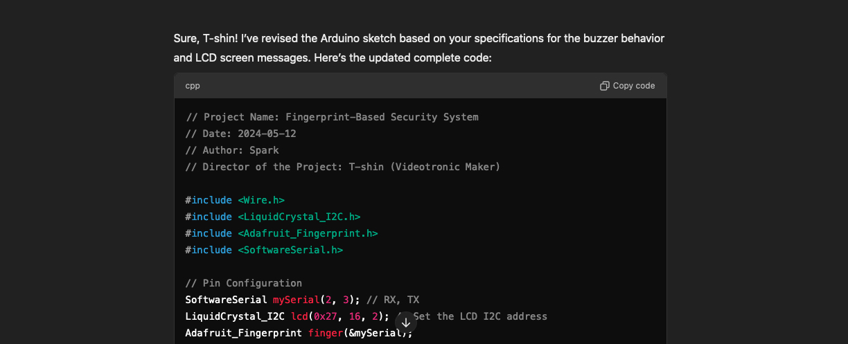 AI แสดงความเข้าใจในการเขียนโปรแกรม Arduino และความต้องการของ Project โดยตอบกลับมาด้วย Code ที่อัปเดตแล้ว ซึ่งรวมถึงการเปลี่ยนแปลงตามที่ร้องขอ สิ่งนี้แสดงให้เห็นถึงความสามารถในการเข้าใจคำสั่งที่ซับซ้อนและสร้าง Code ที่แม่นยำเพื่อให้ได้ผลลัพธ์ตามที่ต้องการ