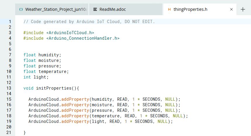 7. เข้าไปในแถบ thingProperties.h และตรวจสอบให้แน่ใจว่า variables ของคุณถูกตั้งค่าอย่างถูกต้องโดยเปรียบเทียบกับ code ด้านล่าง