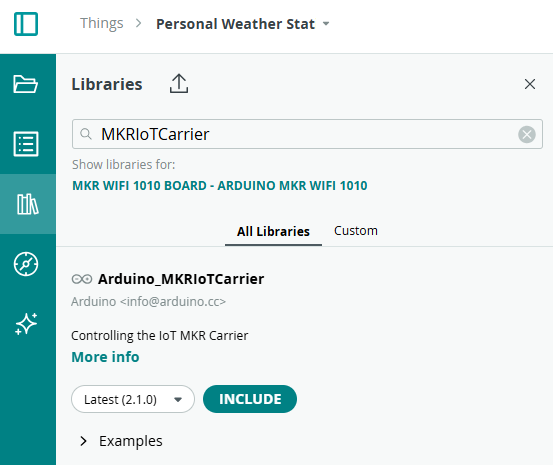 อันดับแรก เราต้องติดตั้ง library ที่จำเป็นเพื่อให้ code ทำงานได้ ไปที่แถบ LIBRARIES ทางด้านซ้ายของหน้าจอและติดตั้ง Arduino_MKRIoTCarrier library