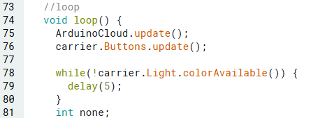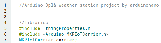 ทำการ Include MKRIoTCarrier Library รวมถึงไฟล์ thingProperties.h และกำหนดค่าเริ่มต้น MKRIoT Carrier ตามที่แสดง: