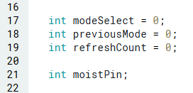 ขั้นตอนสุดท้ายก่อนเริ่มเขียนฟังก์ชัน setup() เราต้องการตัวแปร 4 ตัวเพื่อใช้สลับระหว่างโหมดต่างๆ:
