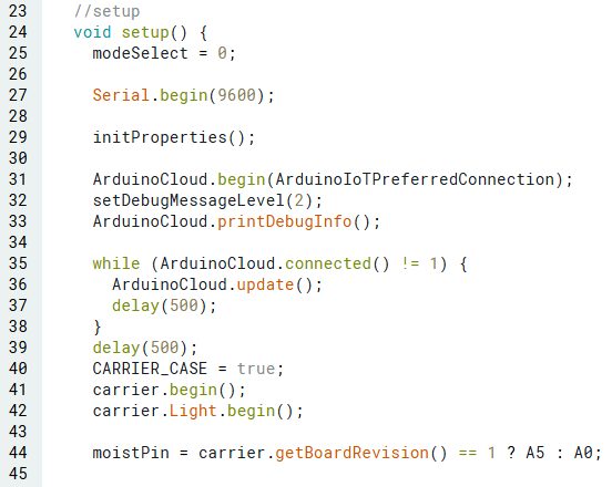 เริ่มต้นด้วยการเชื่อมต่อ Cloud และสิ่งที่จำเป็นอื่นๆ โดยใช้ code ต่อไปนี้ ซึ่งจะเริ่มการทำงานของ Serial, เชื่อมต่อบอร์ดกับ cloud และตั้งค่าตัวแปรบางอย่าง (เช่น moisture Pin ในบรรทัดที่ 44)