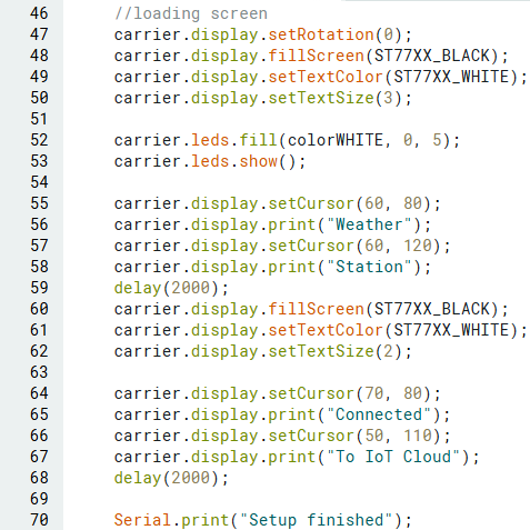 ขั้นตอนต่อไปคือการเขียนโปรแกรมสำหรับหน้าจอ loading ซึ่งจะปรากฏขึ้นเมื่อบอร์ดเชื่อมต่อกับแหล่งจ่ายไฟ หน้าจอ loading จะมีข้อความ 2 ส่วน ส่วนแรกคือชื่อโปรเจกต์ ("Weather Station") และอีกส่วนแสดงว่าบอร์ดเชื่อมต่อกับ Arduino Cloud สำเร็จแล้ว ("Connected to Arduino Cloud")