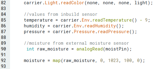 ตอนนี้เราสามารถอ่านค่าที่ sensor วัดได้ โดยเขียน code ต่อไปนี้ลงในฟังก์ชัน loop สำหรับค่า temperature, humidity, pressure และ light level เราสามารถใช้ sensor ที่ติดตั้งมาในบอร์ด MKR IoT ได้โดยตรง แต่สำหรับค่า moisture เราจะอ่านค่า analog Input จาก moisture pin จากนั้นค่า moisture จะถูกนำไป map บนสเกล 0 ถึง 100 เพื่อให้เราสามารถแสดงผลเป็นเปอร์เซ็นต์ % ได้ในภายหลัง