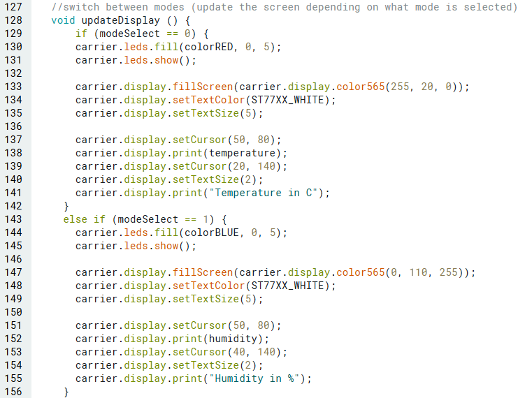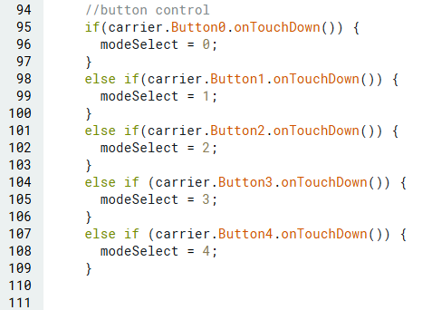 ในการสลับระหว่างโหมดทั้ง 5 เราจะใช้ 5 buttons บน MKR IoT Carrier Rev 2 โดยเราจะเขียน if-statements เพื่อตรวจสอบว่ามีปุ่มใดถูกกดหรือไม่
