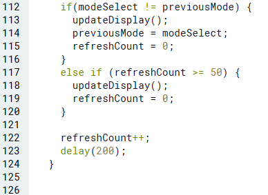 ขั้นตอนสุดท้ายก่อนที่ code จะเสร็จสมบูรณ์ คือการเพิ่มโหมดแสดงผล 5 รูปแบบสำหรับหน้าจอ ซึ่งจะแสดงผลตามโหมดที่เราเลือกผ่านปุ่ม (ตัวแปร modeSelect) โดยในแต่ละโหมดจะมีสีเป็นของตัวเอง (ที่เราตั้งค่าไว้ในขั้นตอนที่ 2) เพื่อให้แยกแยะได้ง่ายขึ้น