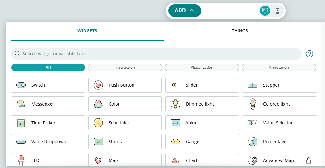 4. คลิกปุ่ม "ADD" และเลือก widgets ที่คุณต้องการใช้เพื่อแสดงผลข้อมูลของคุณ