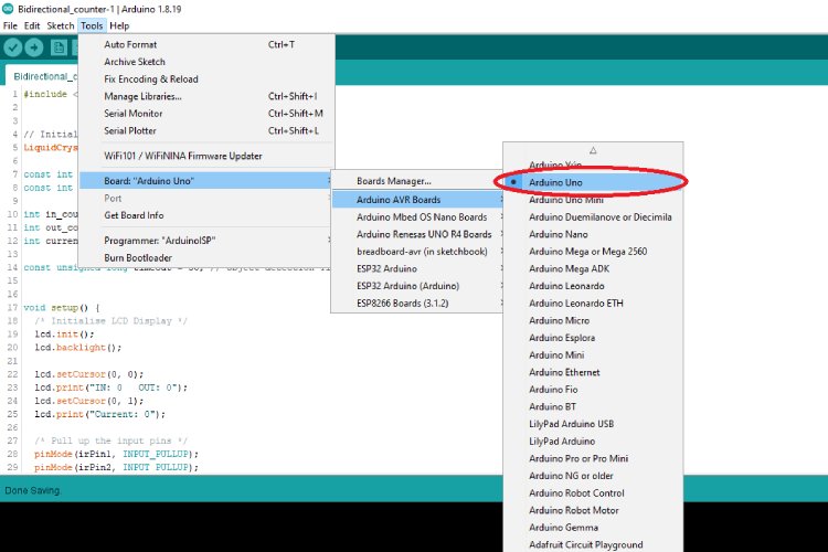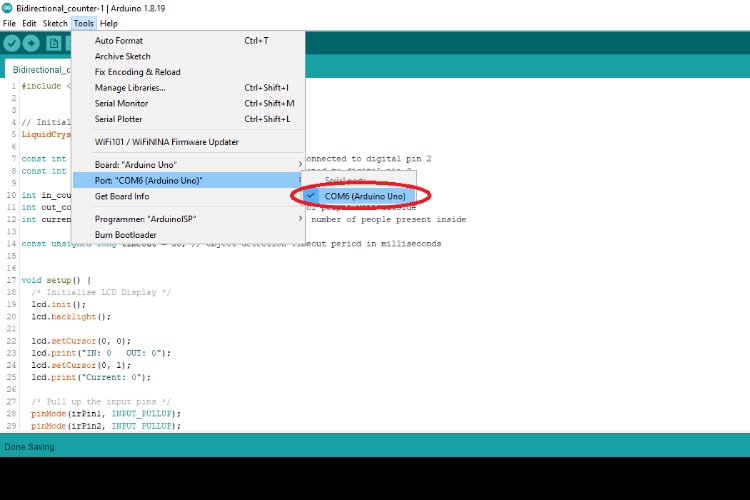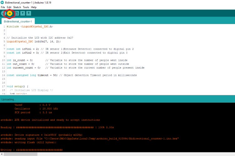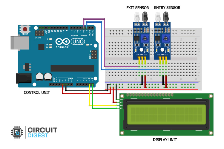 ด้านบนนี้ คุณจะพบกับแผนผังวงจรที่สมบูรณ์สำหรับ Bidirectional Counter โดยใช้ Arduino แผนผังวงจรด้านล่างแสดงวิธีเชื่อมต่อ Arduino, IR Sensor หนึ่งคู่ และ LCD Display เข้าด้วยกันเพื่อสร้างระบบที่ใช้งานได้จริง