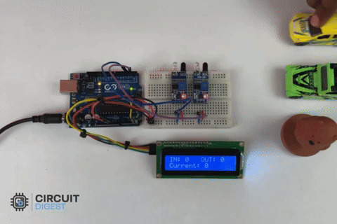 ในภาพด้านบน คุณจะพบกับ Hardware setup จริงของระบบ Bidirectional Counter โดยใช้ Arduino และ IR Sensor โดยใช้แผนผังวงจรด้านบนเป็นข้อมูลอ้างอิง